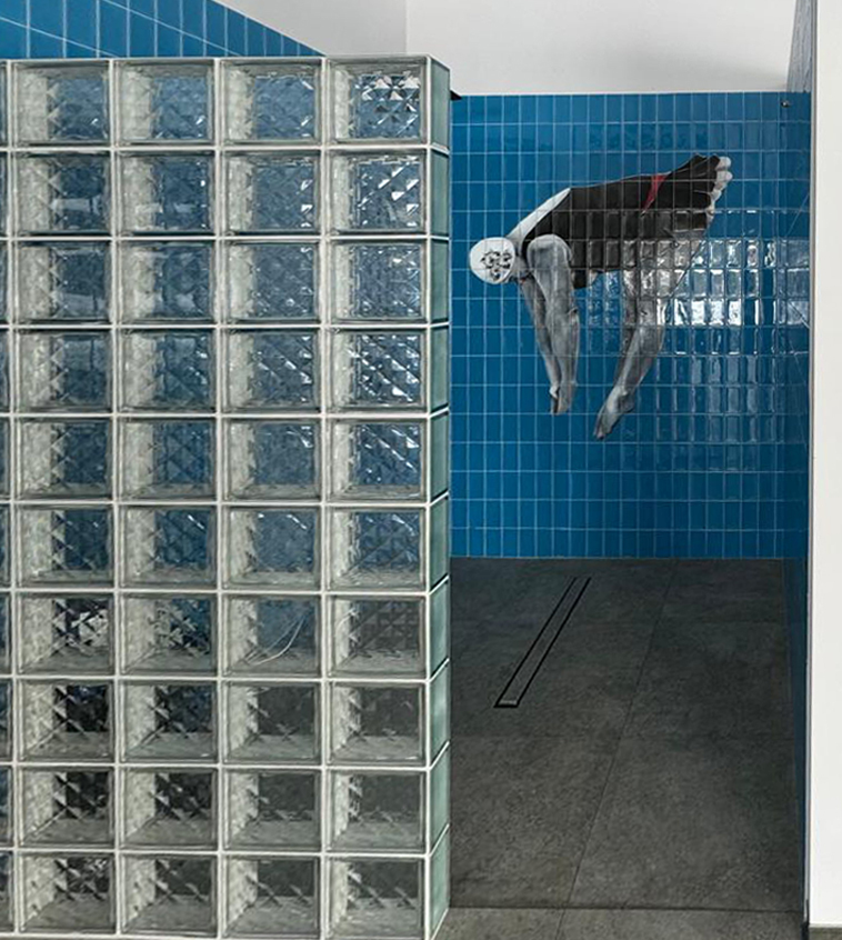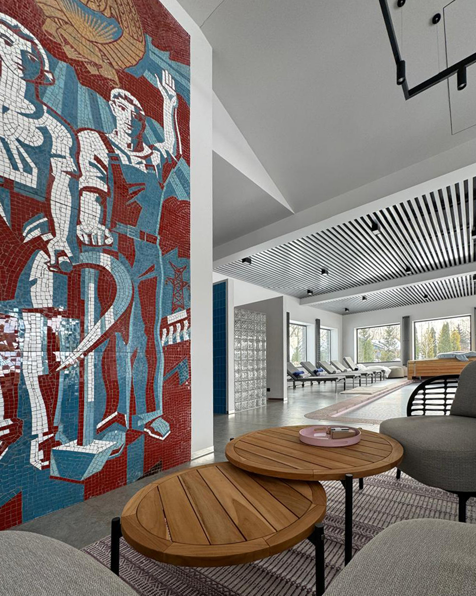 Один из проектов в советском стиле — зона бассейна в частном доме. Вдохновением для оформления стало подлинное мозаичное панно советской эпохи, которое владельцы приобрели на аукционе. Именно оно задало направление всей стилистике интерьера. В продолжение этой идеи в душевой было создано ещё одно панно — уже на плитке.