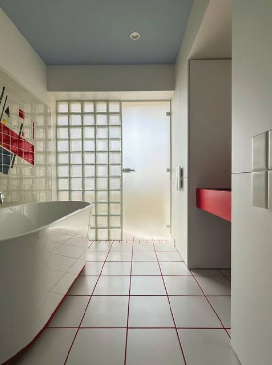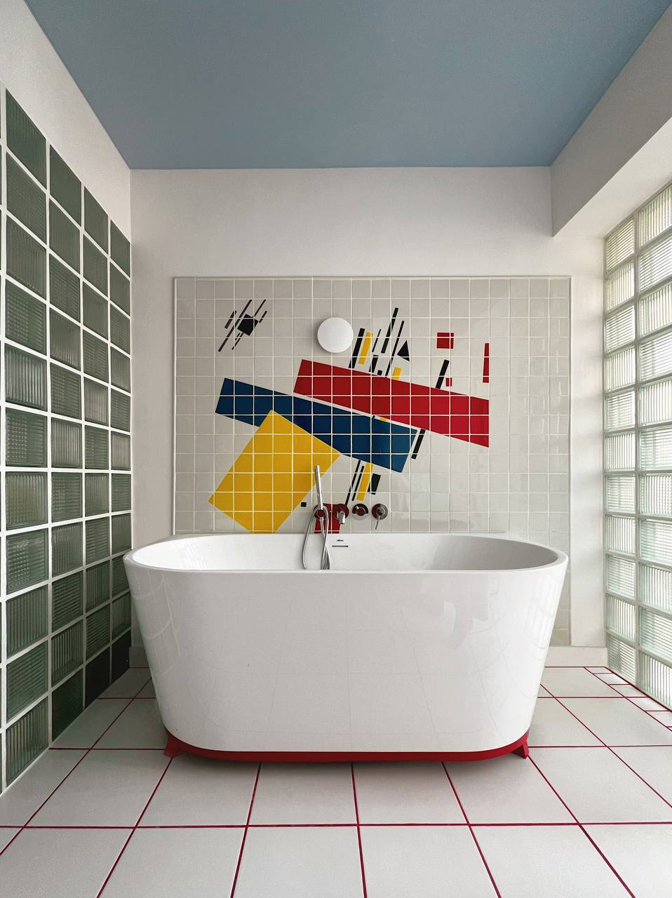 В основе советского стиля лежит конструктивизм — и именно к нему отсылает керамическое панно, выполненное для этой ванной. Абстрактный рисунок в стиле Малевича — это актуальная интерпретация авангарда, органично встроенная в повседневное пространство.