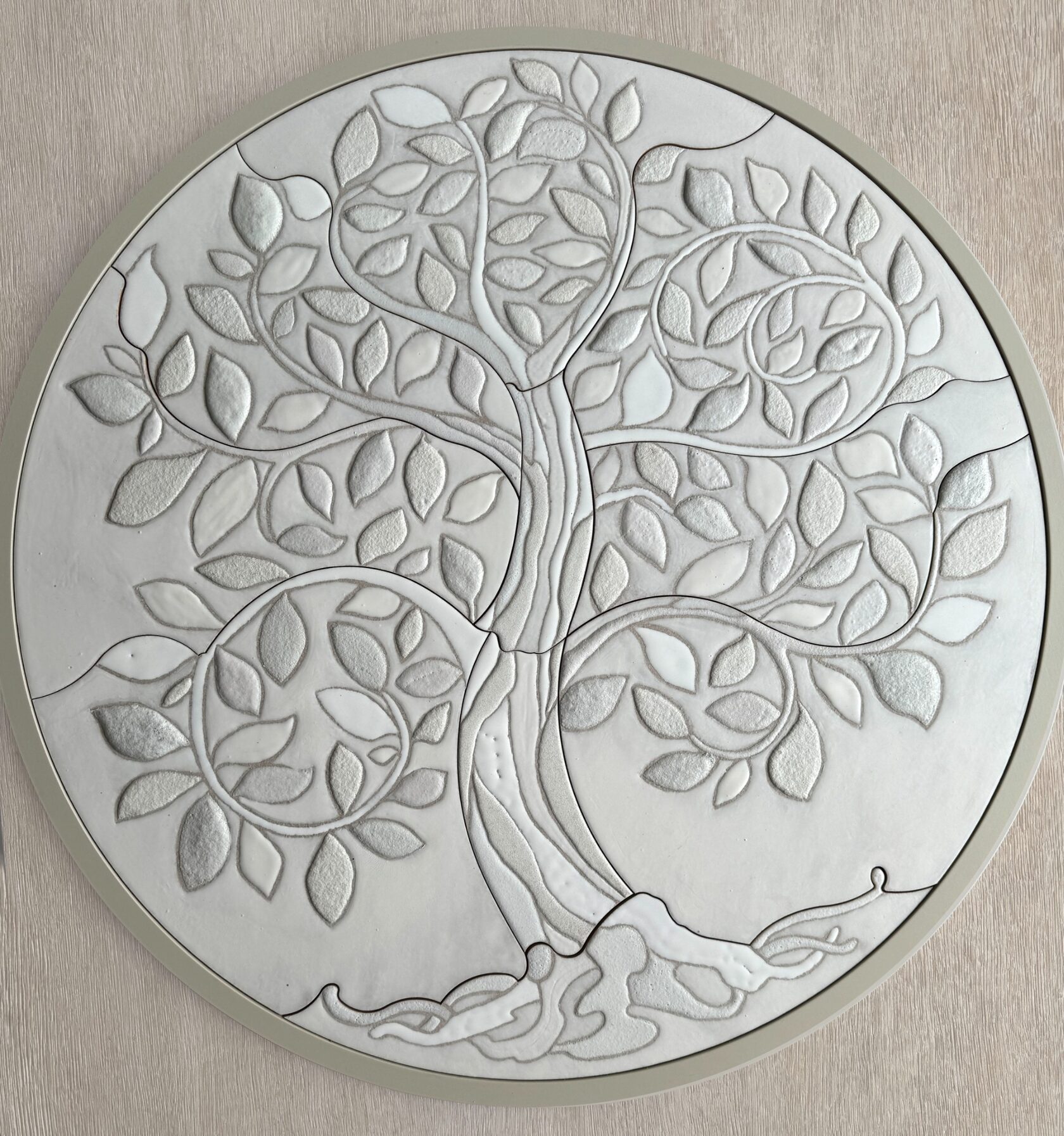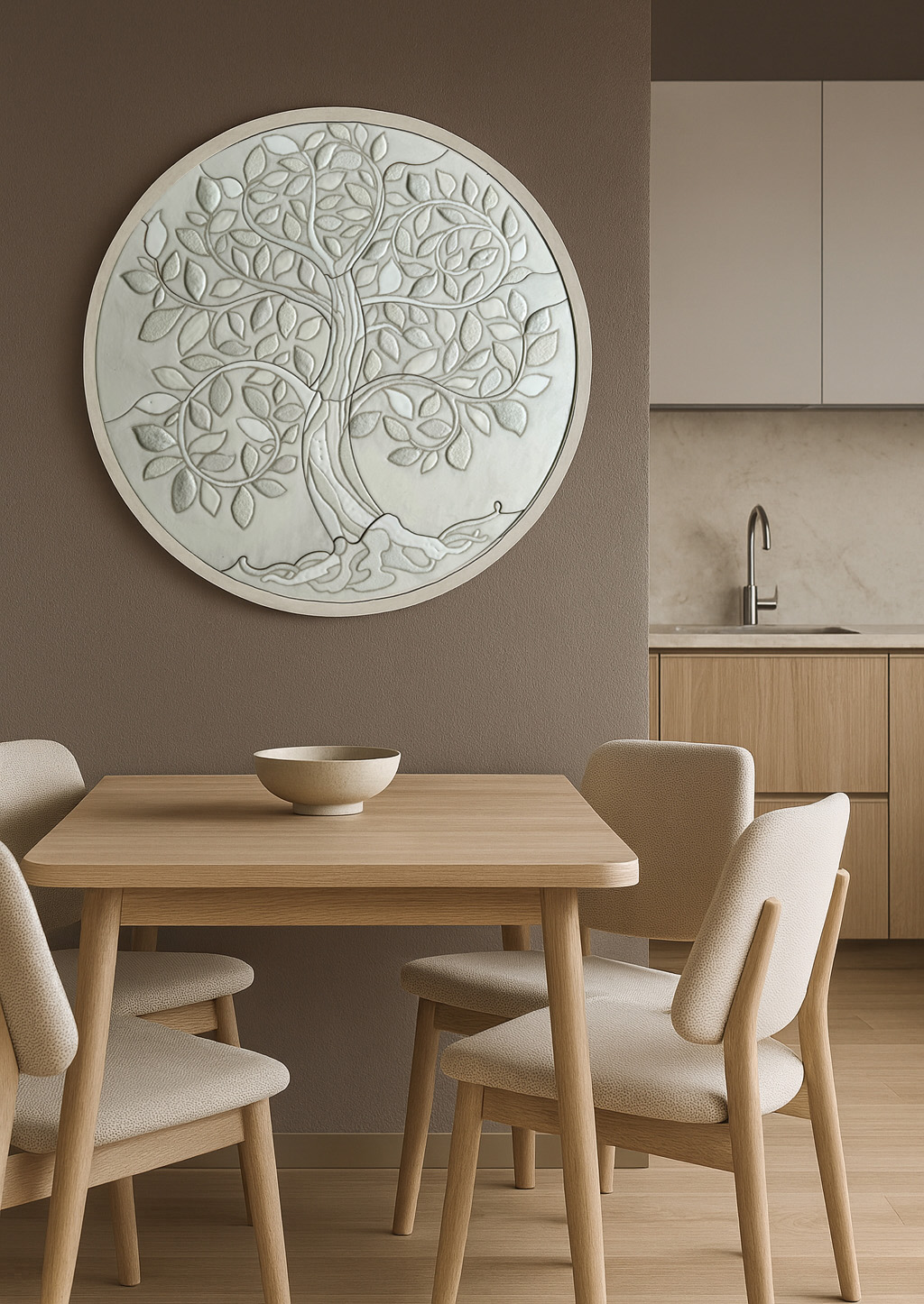 Посмотрите выразительно смотрится панно с деревом. За счёт рельефа и фактуры поверхность «оживает», и свет начинает работать как часть композиции: появляются мягкие тени, глубина, движение.